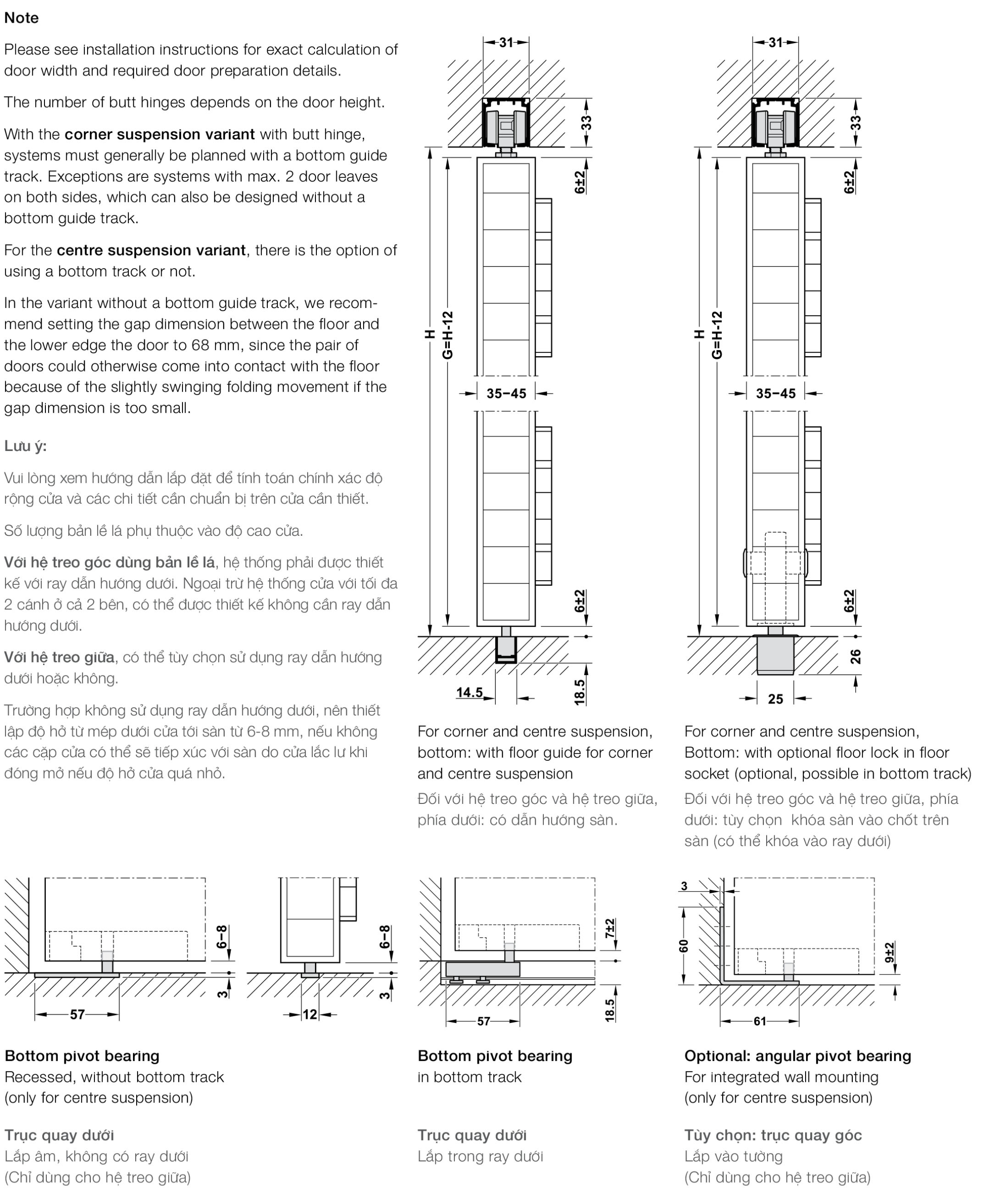 - Lưu ý độ rộng cửa : đối với cửa xếp 1.5 cánh, độ rộng tối đa 1200 với cửa nặng tối đa 80Kg, độ rộng cánh xoay tối đa 800mm