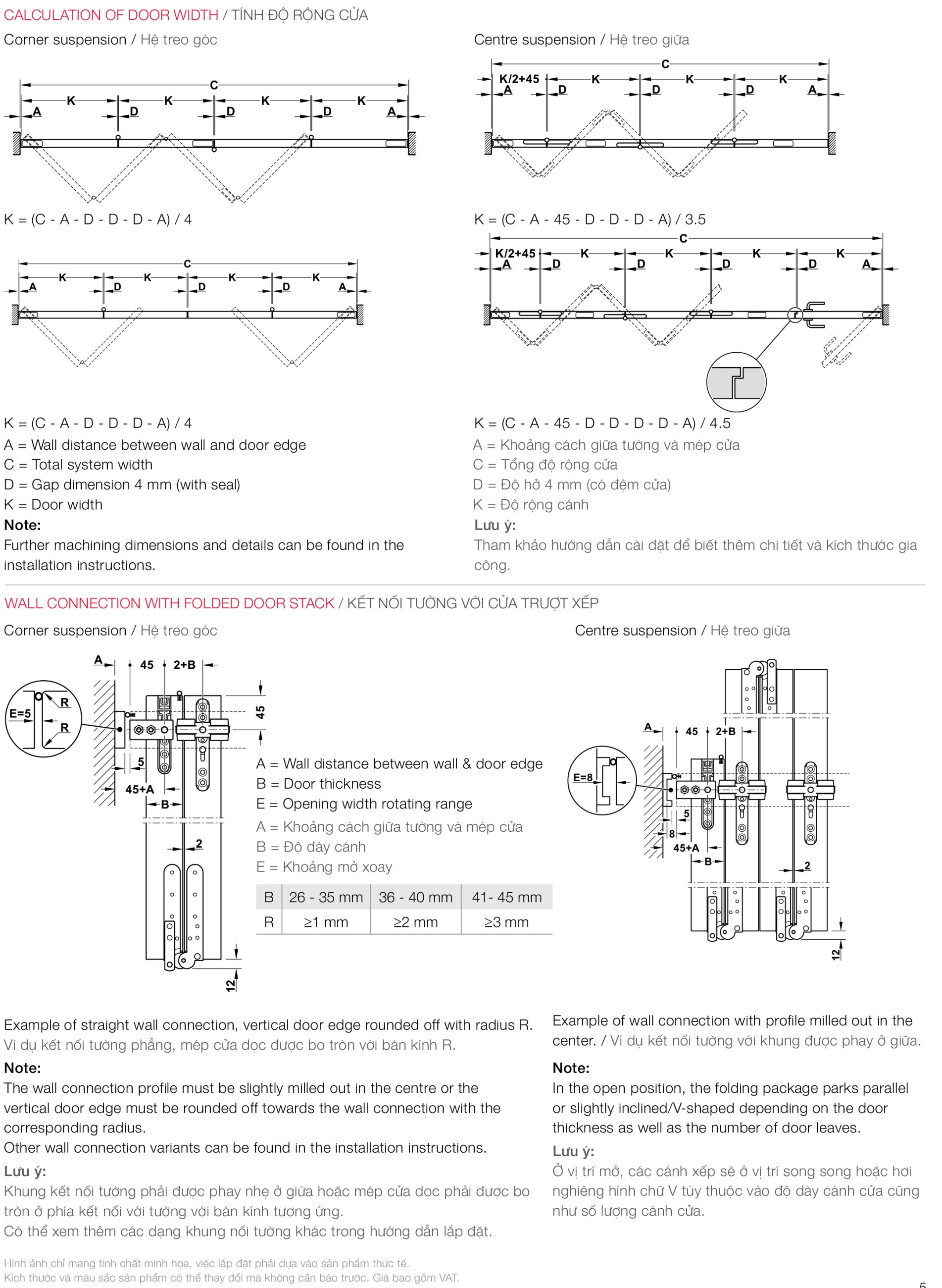 - Số cánh cửa tối đa : 5.5 cánh ( hệ treo giữa ) hoặc 6 cánh ( hệ treo góc ) mỗi bên