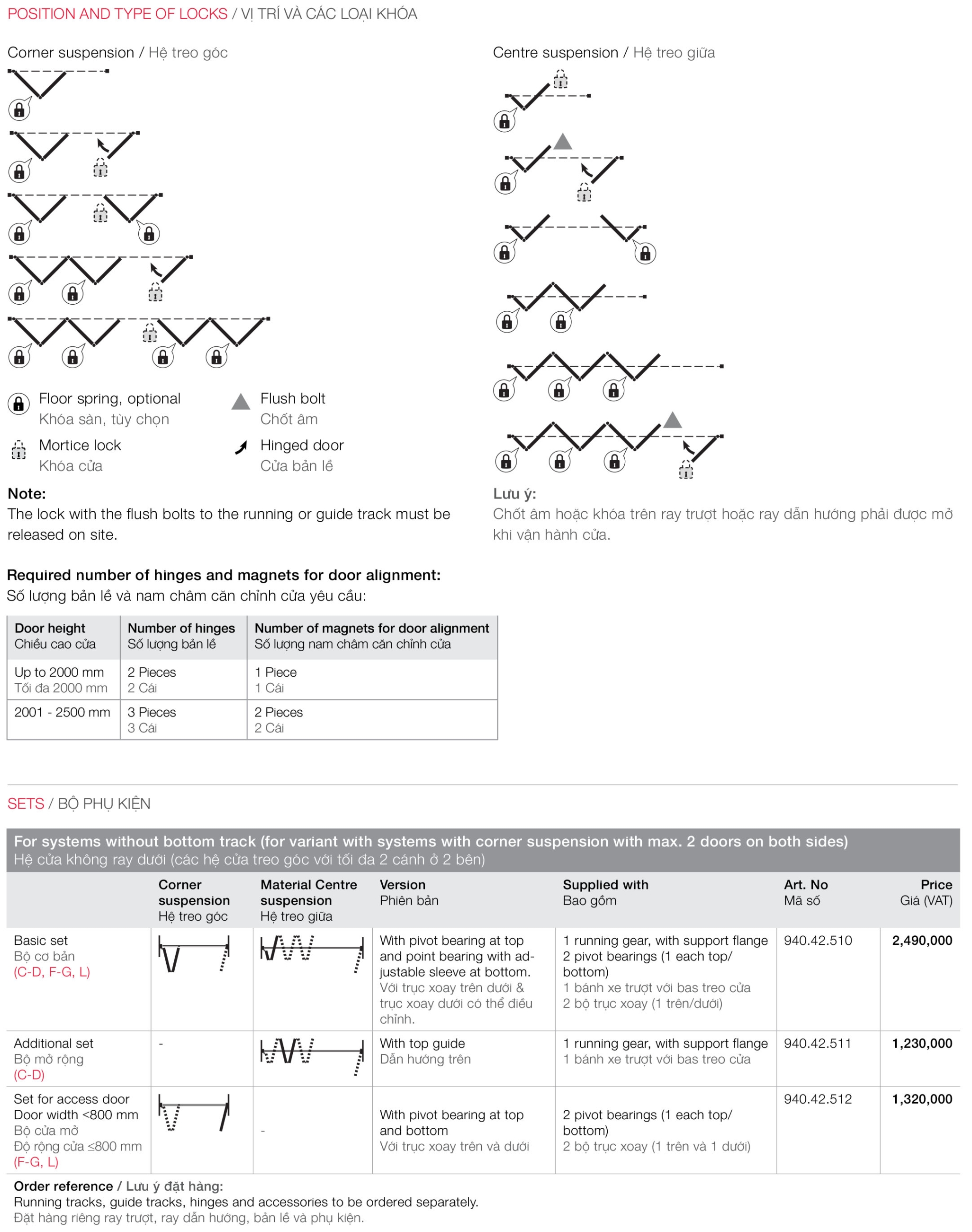 - Hệ cửa không ray dưới ( các hệ cửa treo góc với tối đa 2 cánh ở 2 bên )